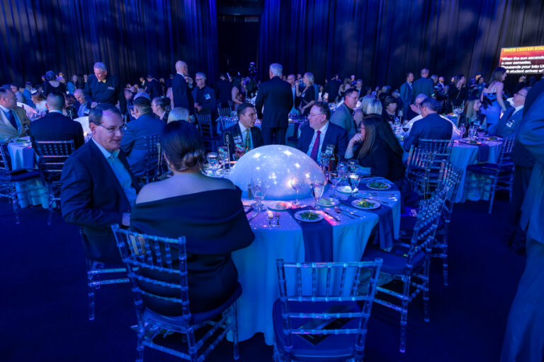 Guests moved through a futuristic, illuminated corridor into a vast, transformed space that felt less like an arena and more like mission control. A massive digital screen shimmered at the front of the room. On each table, dome structures projected dynamic visuals from the ceiling, casting constellations of light across hundreds of faces turned toward the stage.